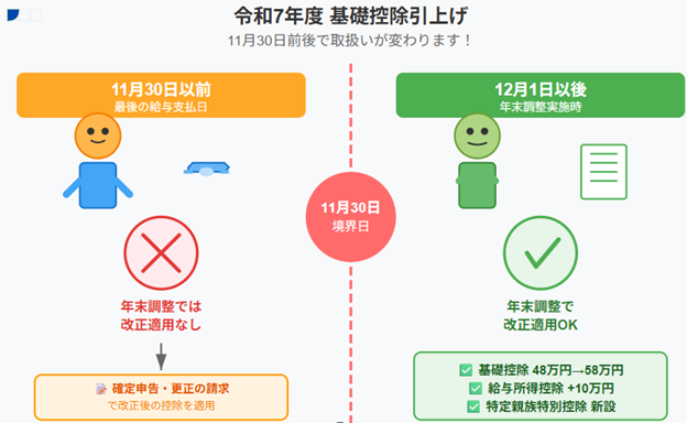 令和7年度税制改正による基礎控除の引上げ等は、12月1日という年度途中での施行となるため、11月30日を境に年末調整での取扱いが大きく異なります。